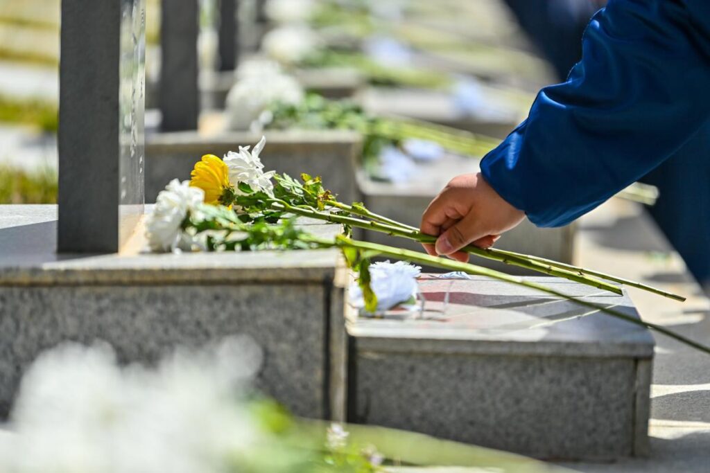 Ao chegarem, os participantes prestaram homenagem observando momentos de silêncio, depositando cestas de flores e limpando as lápides.